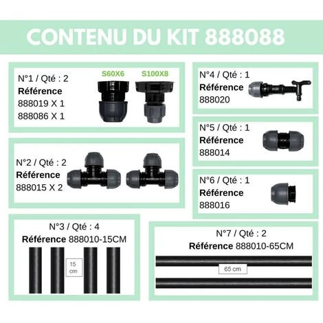 - 2 raccords sorties de cuves ATTENTION : 1 en S60X6 et 1 en S100X8 (référence 888019 + 888086)
